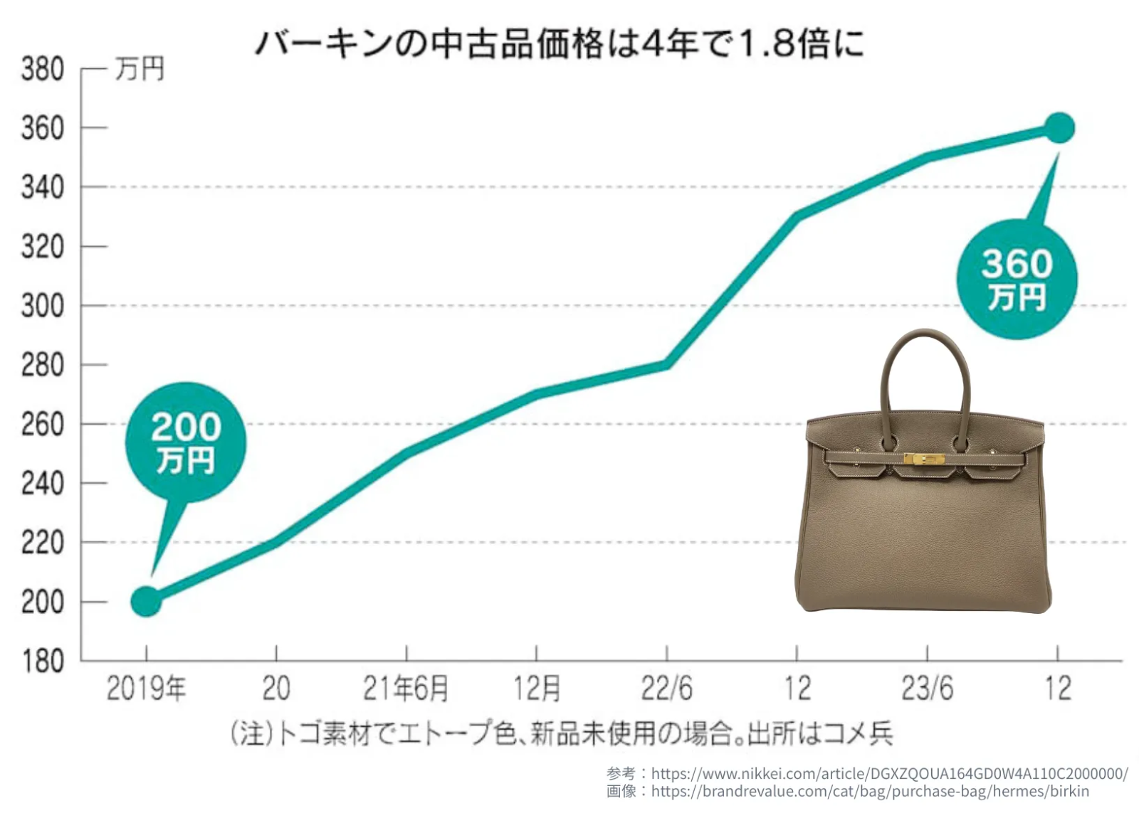 たとえば、エルメスのバーキンの買取相場は数年前から150万円以上も上がっています↓
